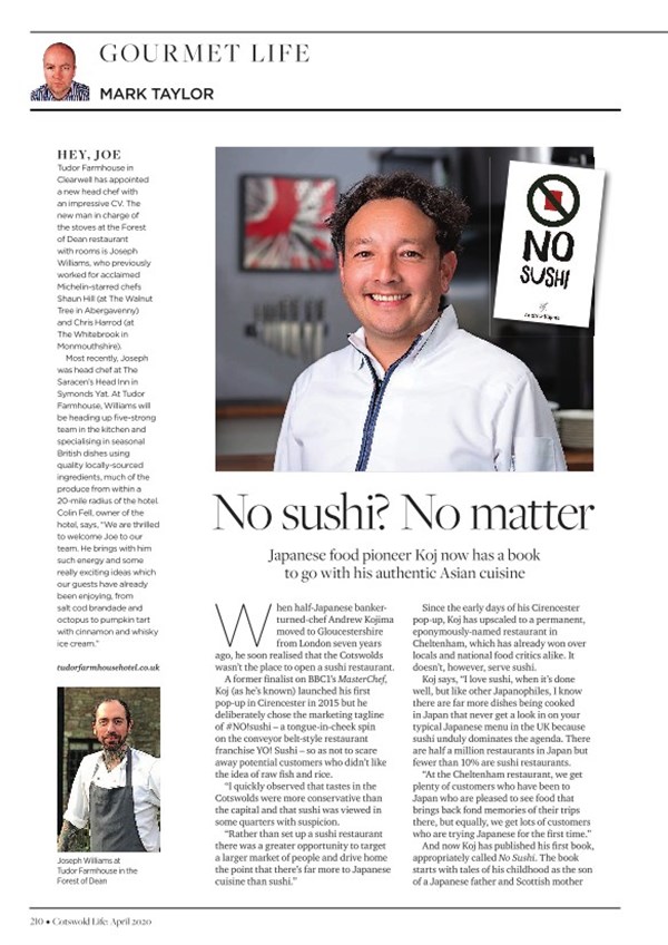 Koj is a member of the Guild of Food WritersHis first book, “No Sushi”, was published in May 2020 by A Way With Media No Sushi £30.00 No Sushi is the debut book by award winning chef and cookery teacher, Koj Buy now ReviewsCookbook Review | The Japan Society | Chef & Restaurant Magazine | Kavey Eats | Cotswold Life